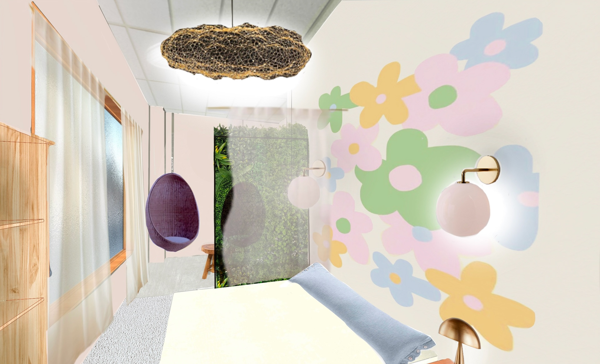 Your stay in one of The Park Hotel's guest rooms will leave you refreshed and ready to explore the reach of your creativity. Taking a step away from the excitement of our bar and art gallery, your personal guest room will enrich your spirit with plush fabrics and relaxing pastel colors. Each room features swing-like hanging lounge chairs for guests to rest in. Iridescent window films cast rays of rainbows throughout the space, furthering a sense of whimsy and positivity. The sleeping area in each room is separated by a wall of plants to provide privacy from the lounge space. The neutral touches in the room act as grounding textures and sights to further your sense of calm. Curtain partitions along the bed and windows act as another touch of luxe privacy. All of these amenities combined work together to support a happy and calm mood in the space.
